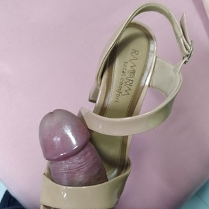 Adoro me exibir de salto e gozando nos sapatos de minha mulher, portanto comente a vontade que nos motiva a fazer mais!!!!